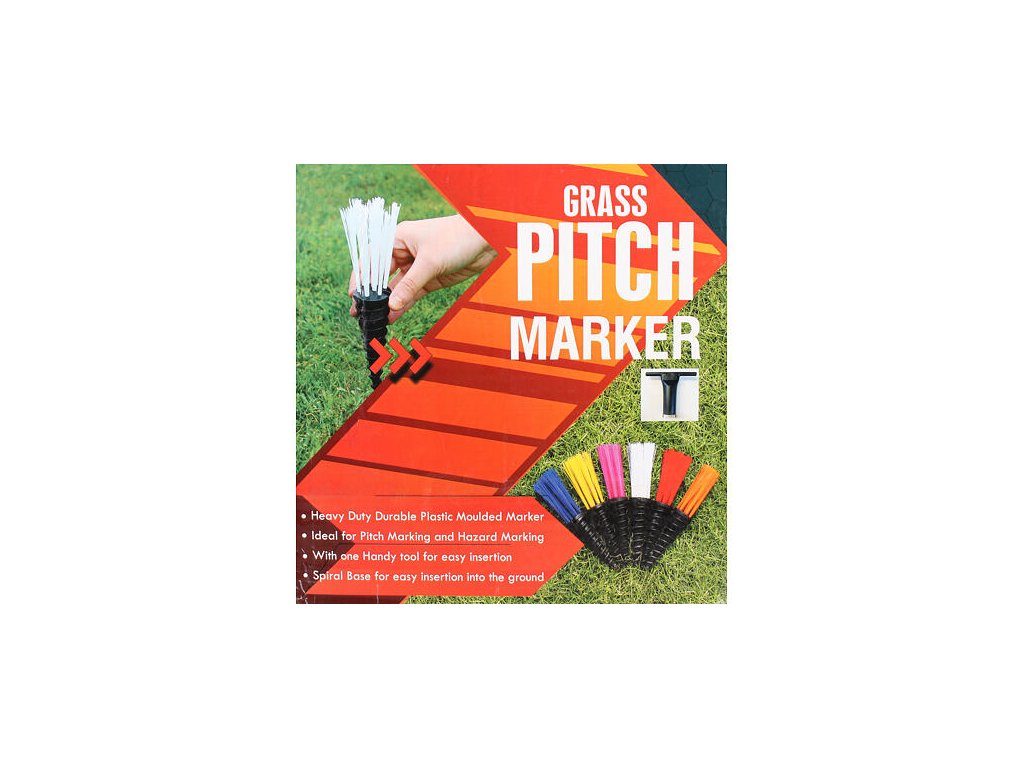 Značkovací systém Pitch Marker je kvalitní pomůcka pro vymezení tréninkové plochy, vyznačování lajn, velkého, malého vápna nebo středového kruhu u travnatého (fotbalového) hřiště, poté zaručuje přesné, rychlé nalajnování. Značkovací systém nabízíme v několika barvách. Klasicky jednoduchá manipulace díky šroubovací kovové hlavici, do které zasunete kolík. Kolík je vyrobený z odolného plastu a připomíná vrták. Otáčivými pohyby jednoduše upevníte kolík do travnaté plochy. Vrták má na horní straně barevné štětinky pro dobrou viditelnost. Využití nalezne také u vyznačení pozemků (staveb), parkovacích ploch, tras energetických rozvodů, apod. V balení naleznete 25 kusů vyznačovacích kolíků a 1 kus šroubovací hlavice. Doporučujeme: Jakmile kolík zarazíte do země, nasypejte do štětinek trochu jemného písku a udusejte, aby se vlákna štětinek co nejvíce rozevřela a vytvořila tak vějíř o průměru cca 7-8 cm. Parametry: výška kolíku: 10 cm výška štětinek: 8 cm obsah balení: 25x kolík, 1x šroubovací hlaviceDoplňkové parametry