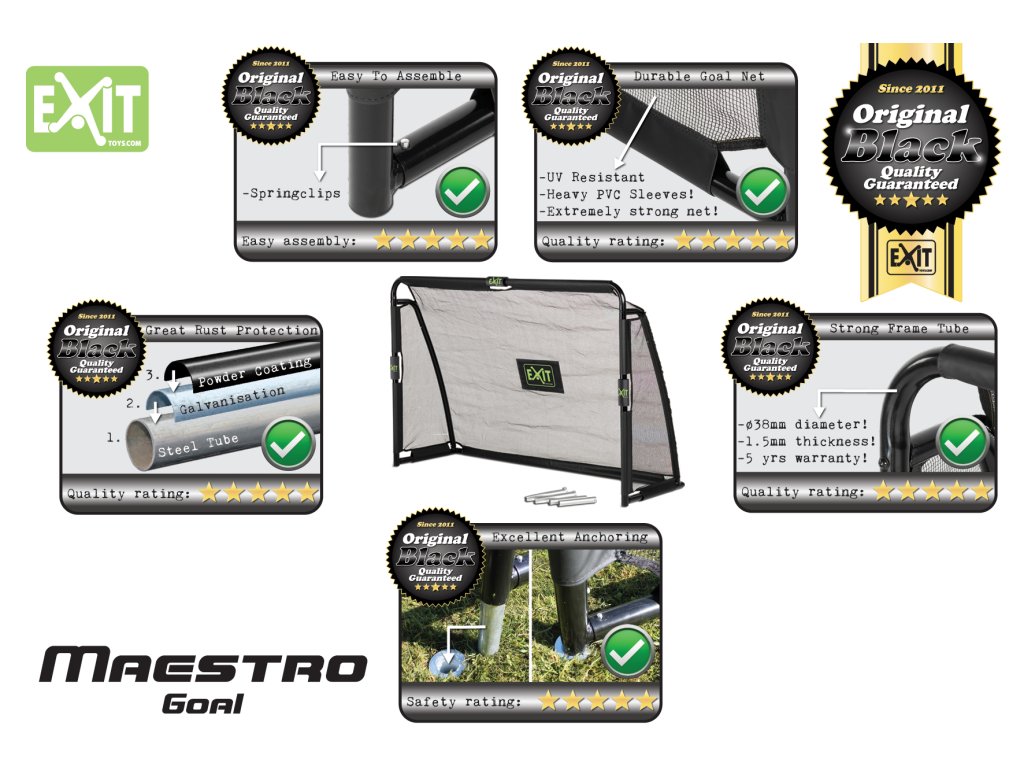 Dejte stylový gól do trendy fotbalové branky! Kdo říká, že všechny branky musí být bílé? A kdo říká, že branky nemůžou vypadat pěkně? Fotbalové branky Exit představují kombinaci robustní konstrukce, překrásného designu a vysoké kvality. Branky Coppa a Meastro jsou ideální při hrách na zahradě, pro velké i malé. Díky svojí černé barvě, propracovanou konstrukcí i sítí budou tyto branky vypadat dobře v každé zahradě a svým jedinečným uchycením síťky a upevněním na trávník dostane Vaše hra ten správný náboj a zážitek.