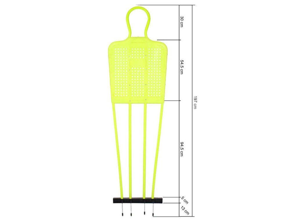 Celoplastová figurína Defence Mannequin s výškou 180 cm a hmotností 3,5 kg slouží k nácviku přesnosti přímých kopů, nácviku herních situací při zahrávání trestných kopů a zároveň i jako tréninková pomůcka pro fotbalové brankáře při těchto situacích. Tréninková figurína Defence Mannequin ve výrazné neonově žluté barvě je vybavena čtyřmi ocelovými 13 cm dlouhými bodci pro stabilní ukotvení do travnatého hřiště. Tato užitečná pomůcka by měla být součástí tréninkové výbavy každého fotbalového klubu. Pro používání figuríny na umělém, nebo jiném pevném povrchu můžete zakoupit stojan Defence Mannequin Base. Podrobné rozměry tréninkové figuríny naleznete ve fotogalerii.
