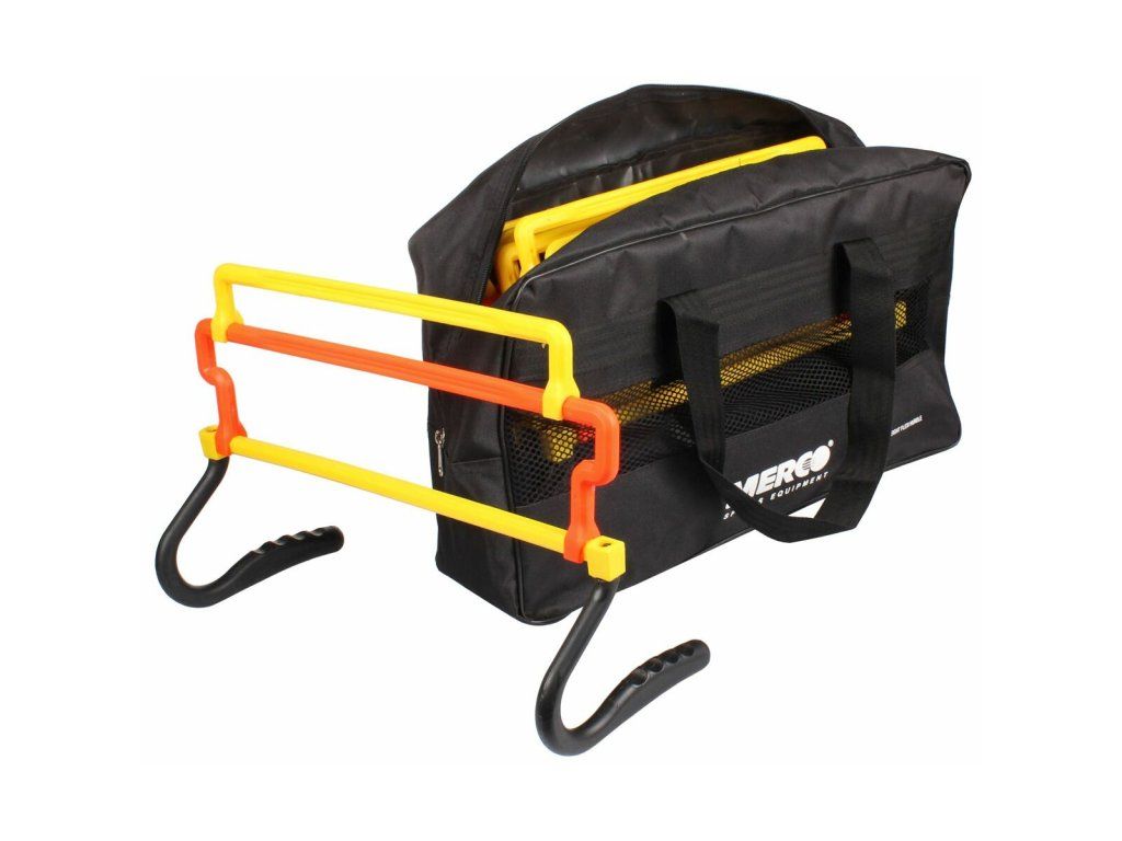 Sada šesti překážek z odolného a lehkého vysokohustotního polyetylenu Merco Universal v praktickém balení slouží k tréninku vertikální i horizontální síly a rychlosti nohou. 44 cm široká plastová překážka Merco Universal umožňuje individuální nastavení výšky na 15 cm, 25 cm a 30 cm, což uživateli přináší větší variabilitu a obtížnost kondičních tréninků. Celková hmotnost sady Merco Universal je 2,5 kg a lze ji používat v interiéru i exteriéru.